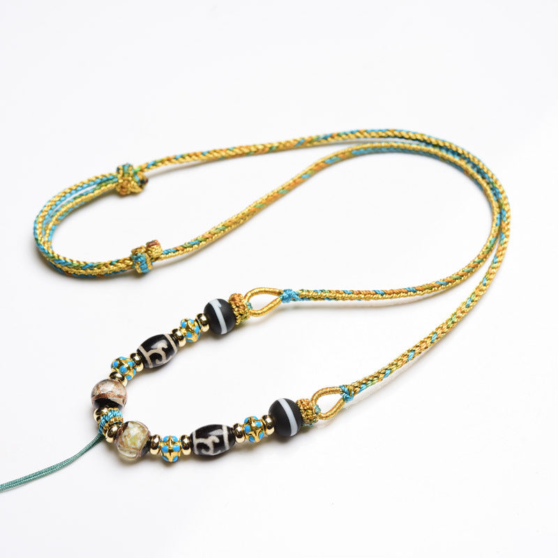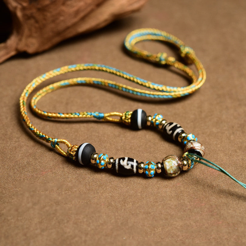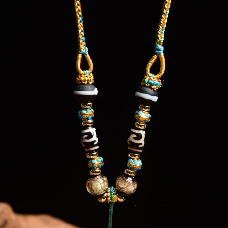 Handwoven Tibetan Buddhist Dzi Bead & ThangkaPendant with Eightfold Blessings